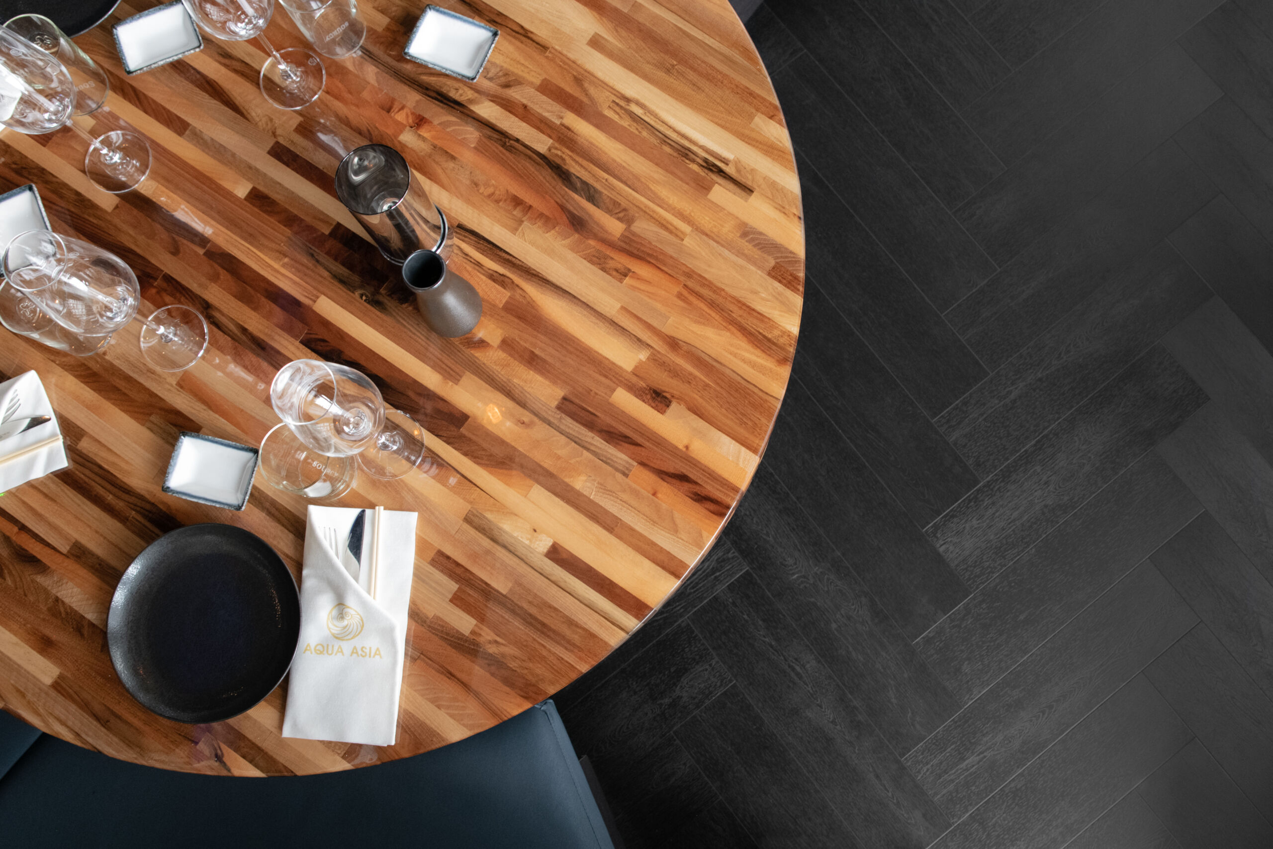 The interior is kept modern, as befits the building and its surroundings. The colors brown and blue of the predominate and complement the black herringbone floor perfectly. The complete picture gives the restaurant a warm and cozy feel!