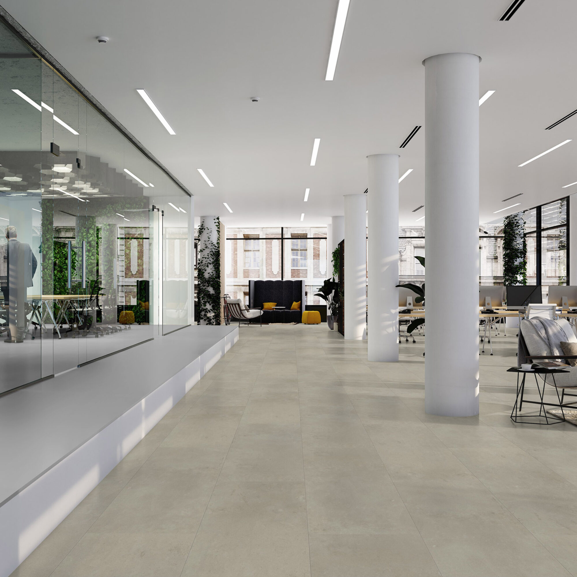The 1800 series are fairly plain concrete-look tiles in five colours. Perfect for an industrial interior. Calm yet tough thanks to the coloured bevelling! Available in dryback and click variant.